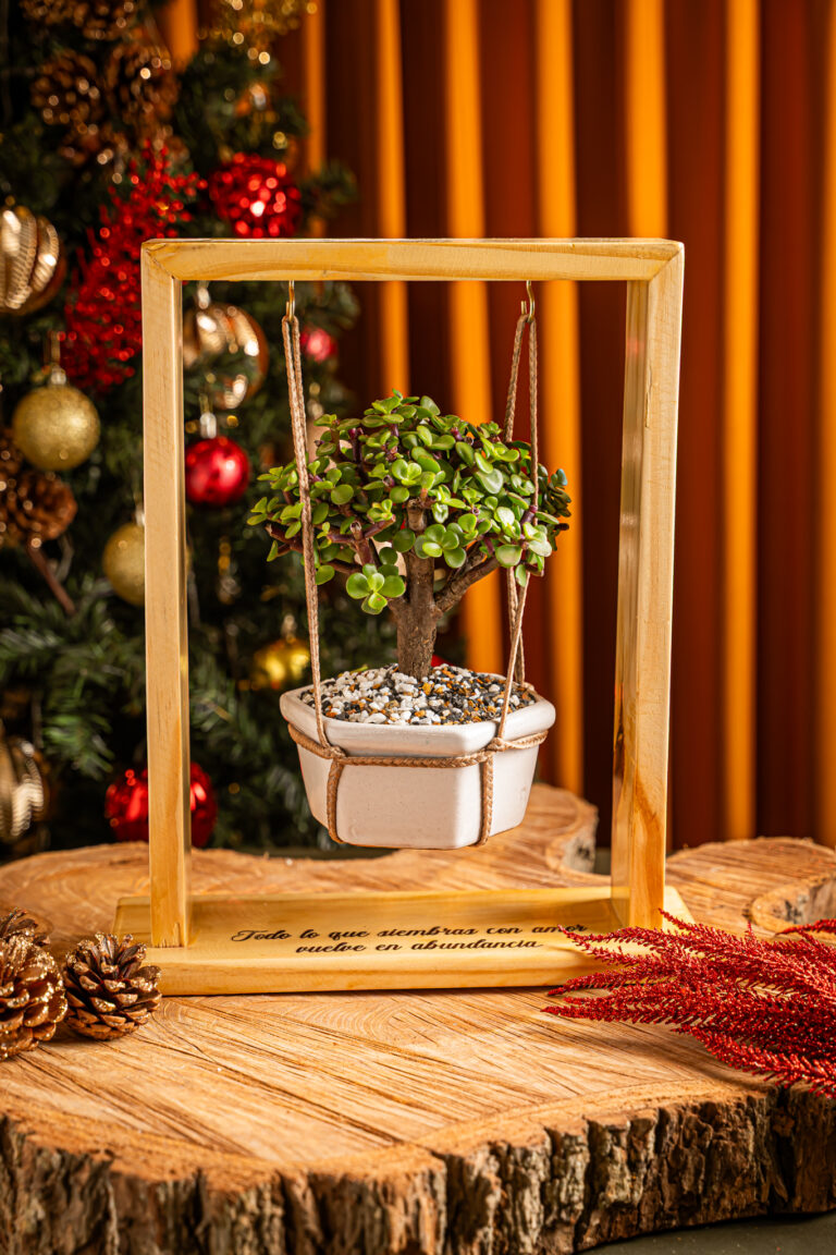 Un detalle que lo dice todo: un bonsái que representa vida duradera, un portarretrato personalizado con esos momentos que no se olvidan, y una presentación pensada para emocionar.