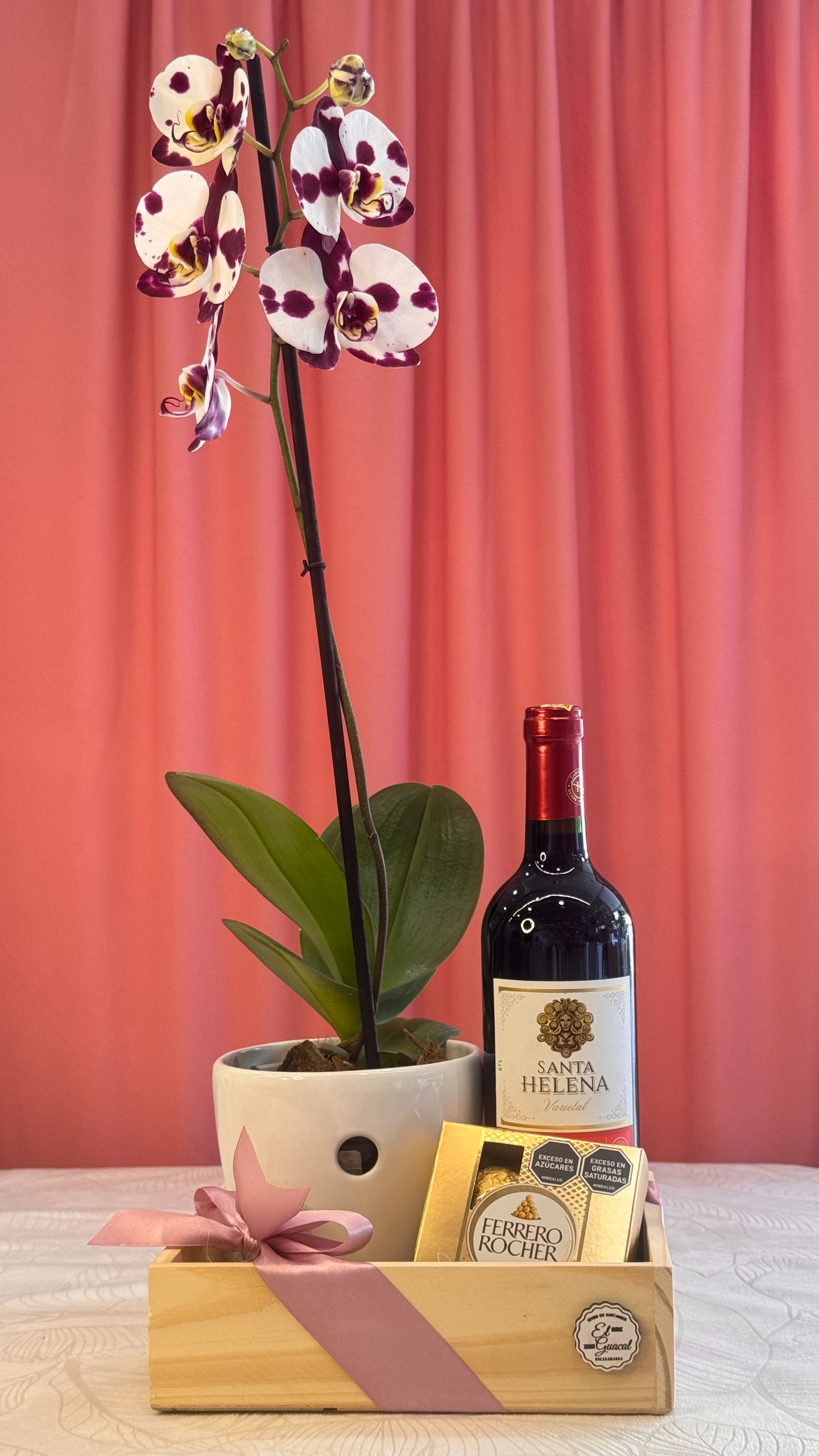 Caja en madera pino con orquídea natural en maceta de cerámica, vino 750 ml, chocolates Ferrero Rocher x4 y tarjeta con mensaje.