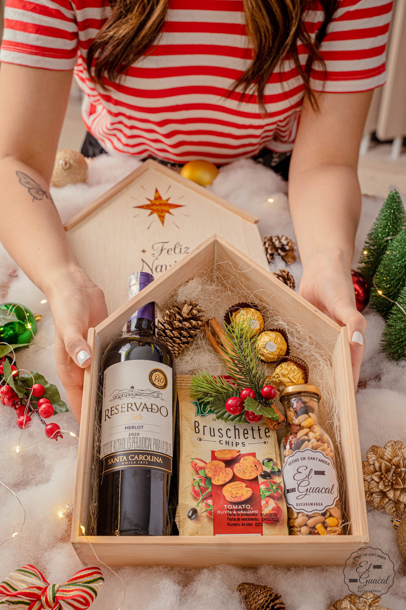 -Estuche de madera en forma de casa. -Vino tinto 750 ml -Bruschettes chips. -Mix de frutos secos 150 g. -Ferreros Rocher por 3 unidades. -Mensaje y de/para.