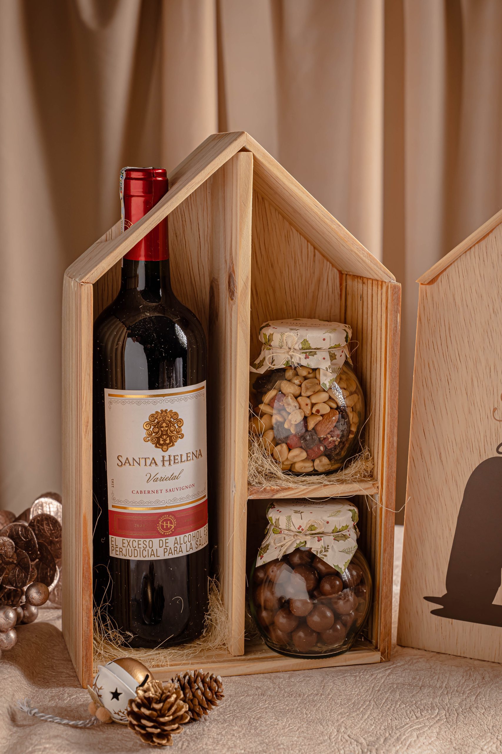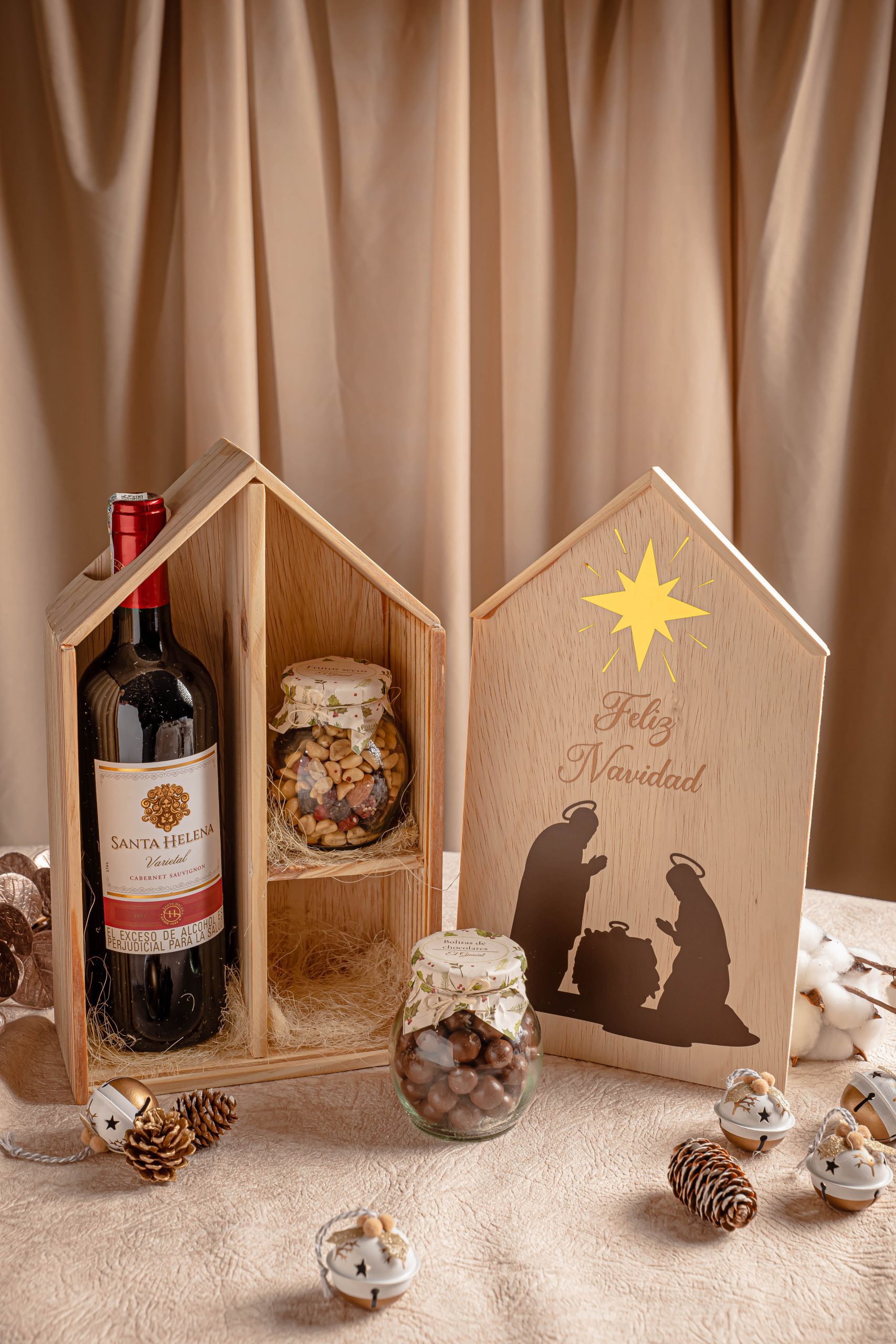 -Estuche de madera en forma de casa. -Vino tinto 750 mL. -Mix de frutos secos 150 g. -Bolitas de chocolate 150 g. -Mensaje y de/para.