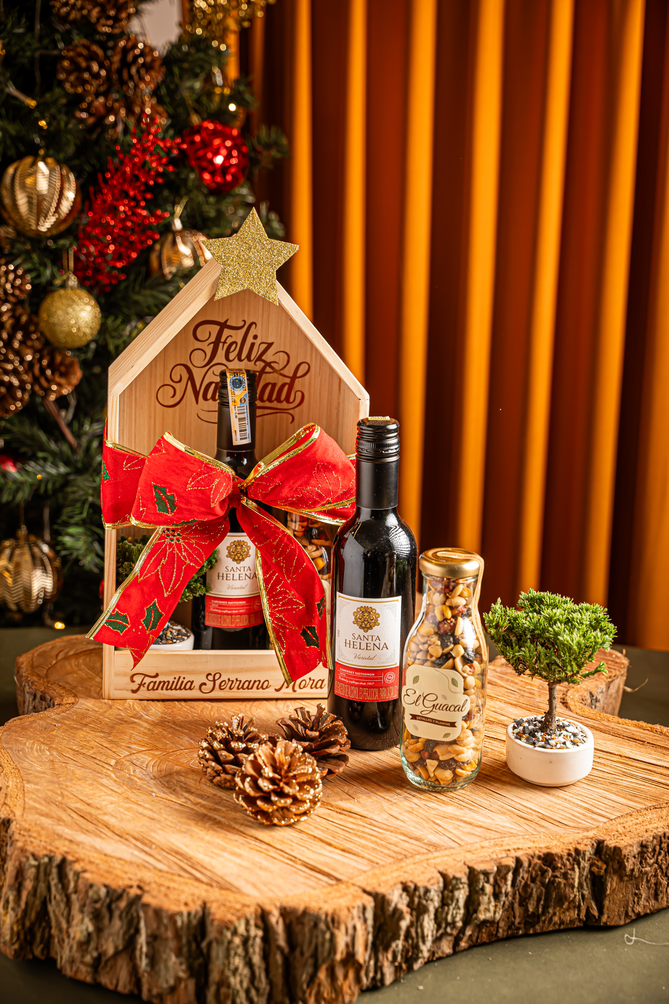 – Casita en madera pino. – Mini mini bonsái natural. – Vino 375ml. – Mix de frutos secos 150g. – Tarjeta con mensaje y de/para.