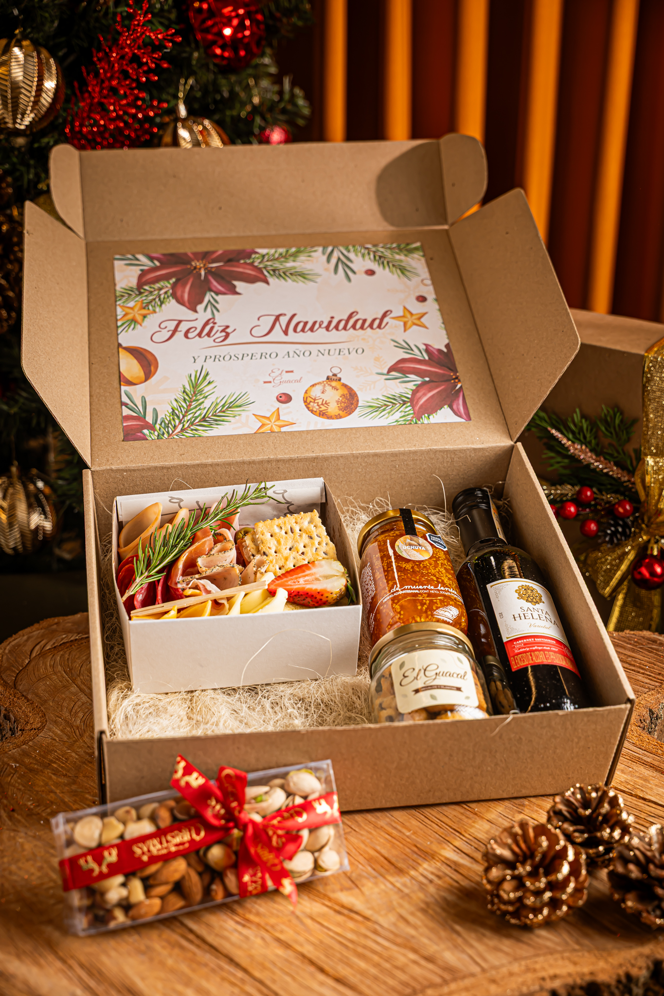 – Caja kraft decorada. – Tabla de carnes y quesos. – Vino 375ml. – Mix de frutos secos. – Mermelada de Muerte Lenta. – Galletas navideñas. – Tarjeta con mensaje y de/para.