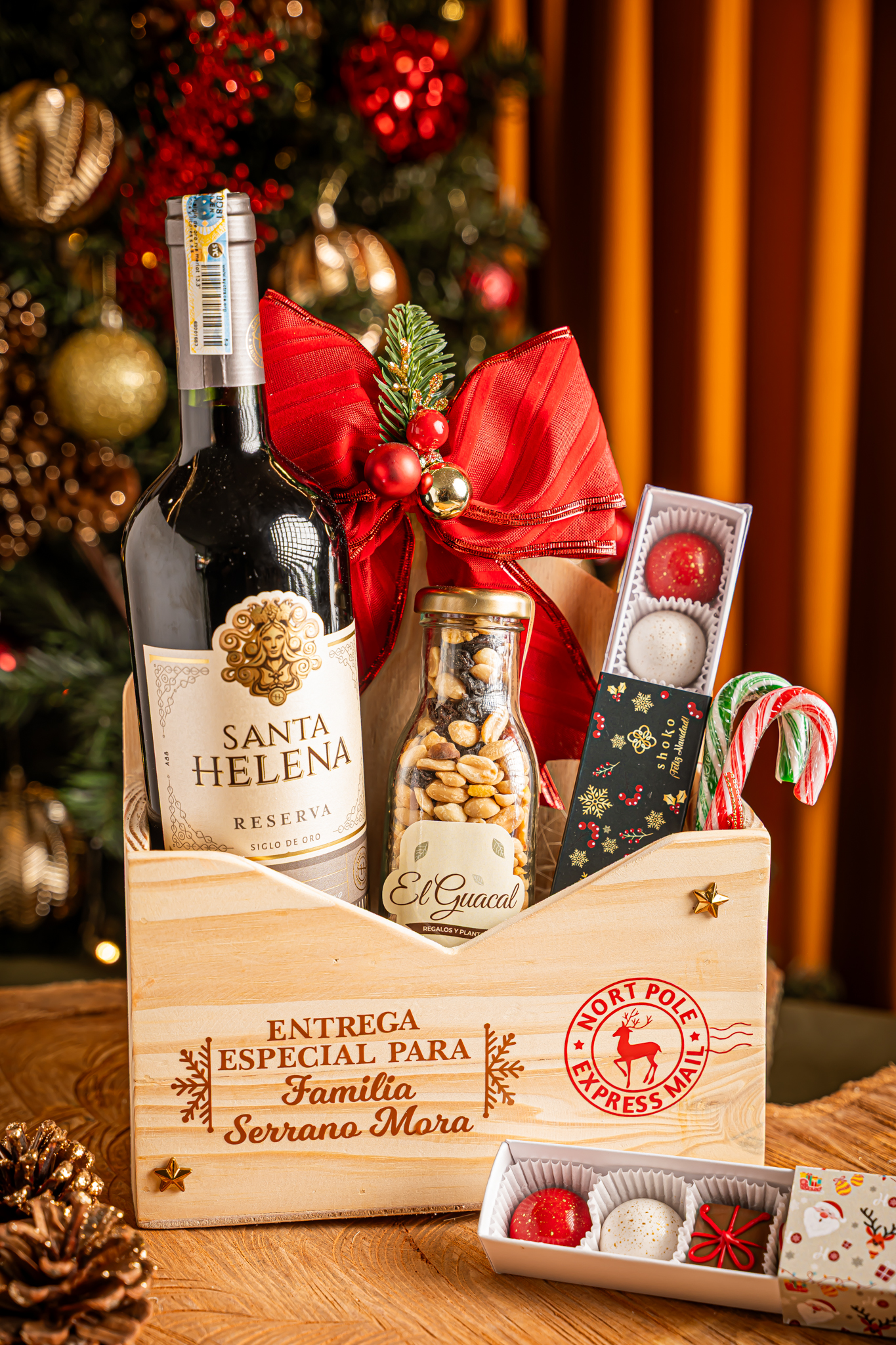 -Caja tipo sobre en madera pino. – Vino reserva 750ml. – Bombones de chocolate x6. – Mix de frutos secos 150g. – Bastones navideños de caramelo. – Tarjeta con mensaje y de/para