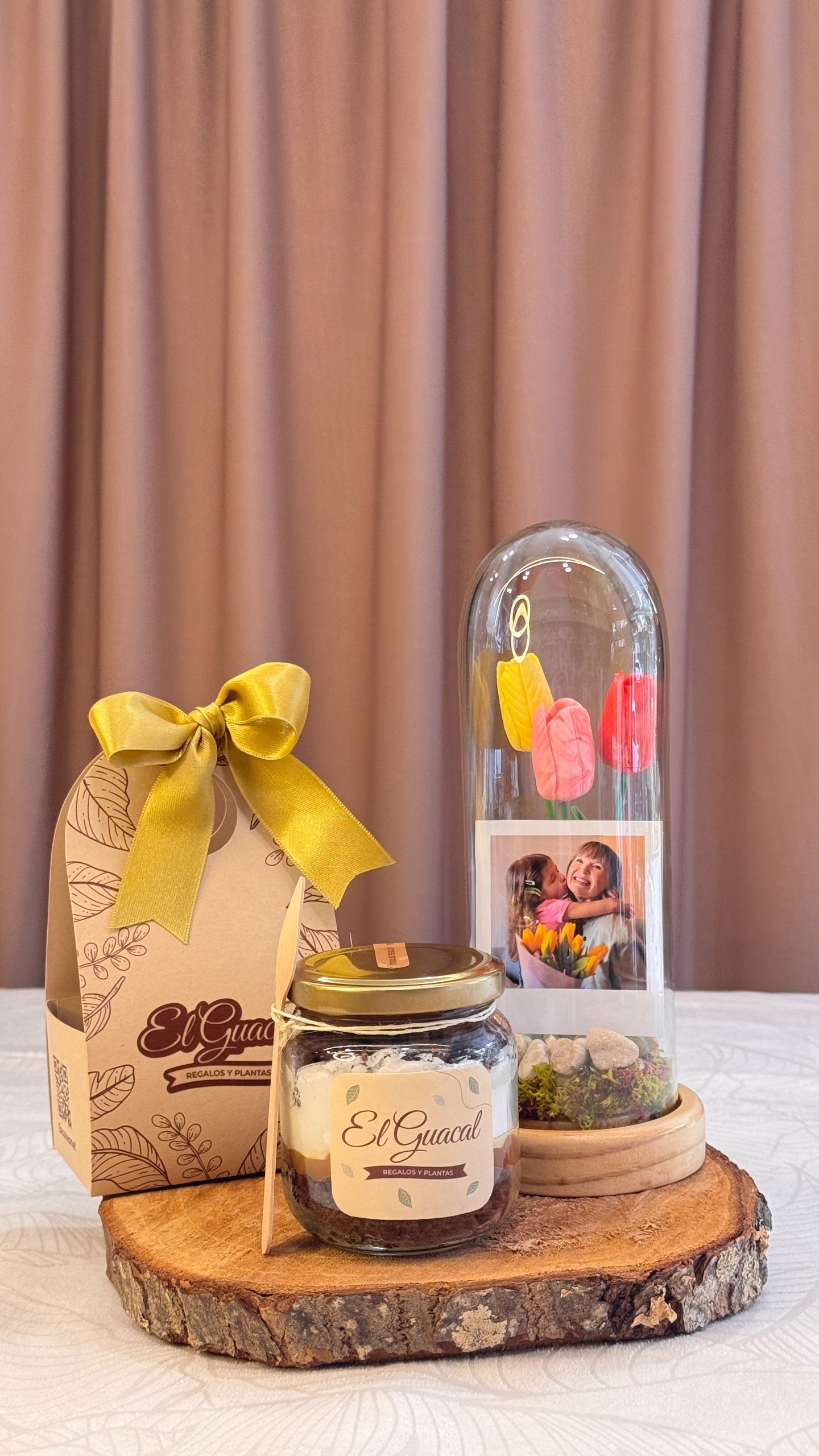 Cápsula de tulipanes en porcelana fría con fotografía personalizada, postre artesanal y tarjeta con mensaje.