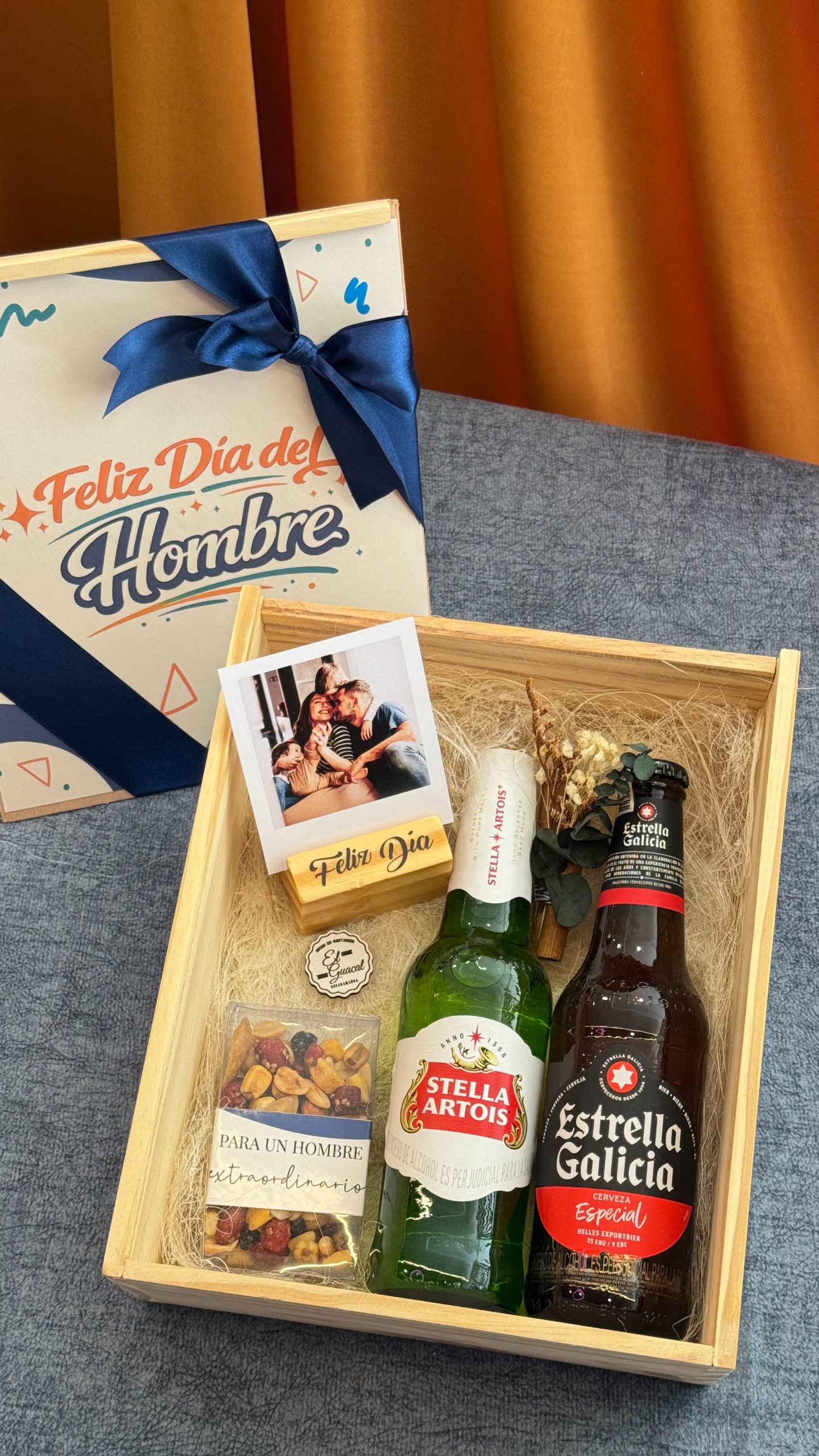 Sorprende con un detalle original que combina sabor, diseño y personalización. Este estuche en madera pino con tapa decorada está pensado para celebrar el Día del Hombre con un regalo especial que incluye cervezas premium, un delicioso mix de frutos secos y una fotografía personalizada en base de madera que se convierte en un recuerdo único.