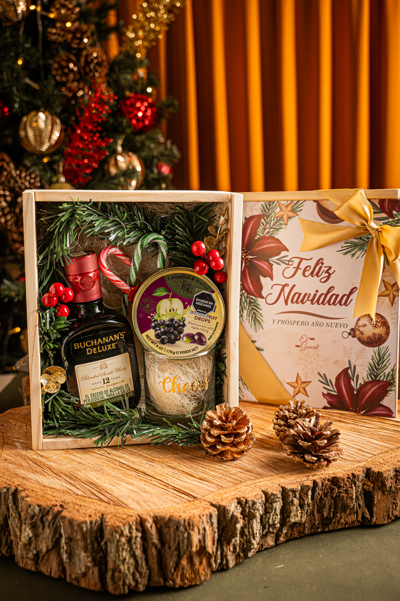 – Estuche en madera pino. – Whisky Buchanans Deluxe 12 Años 375ml. – Vaso para whisky. – Dulces frutales Cavendish & Harvey. – Bastones navideños de caramelo. – Tarjeta con mensaje y de/para.