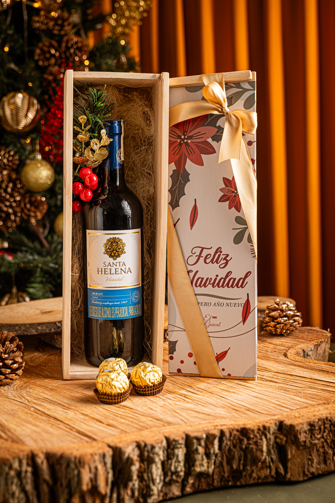 – Estuche en madera pino. – Vino 750ml. – Chocolates Ferrero Rocher x3. – Tarjeta con mensaje y de/para