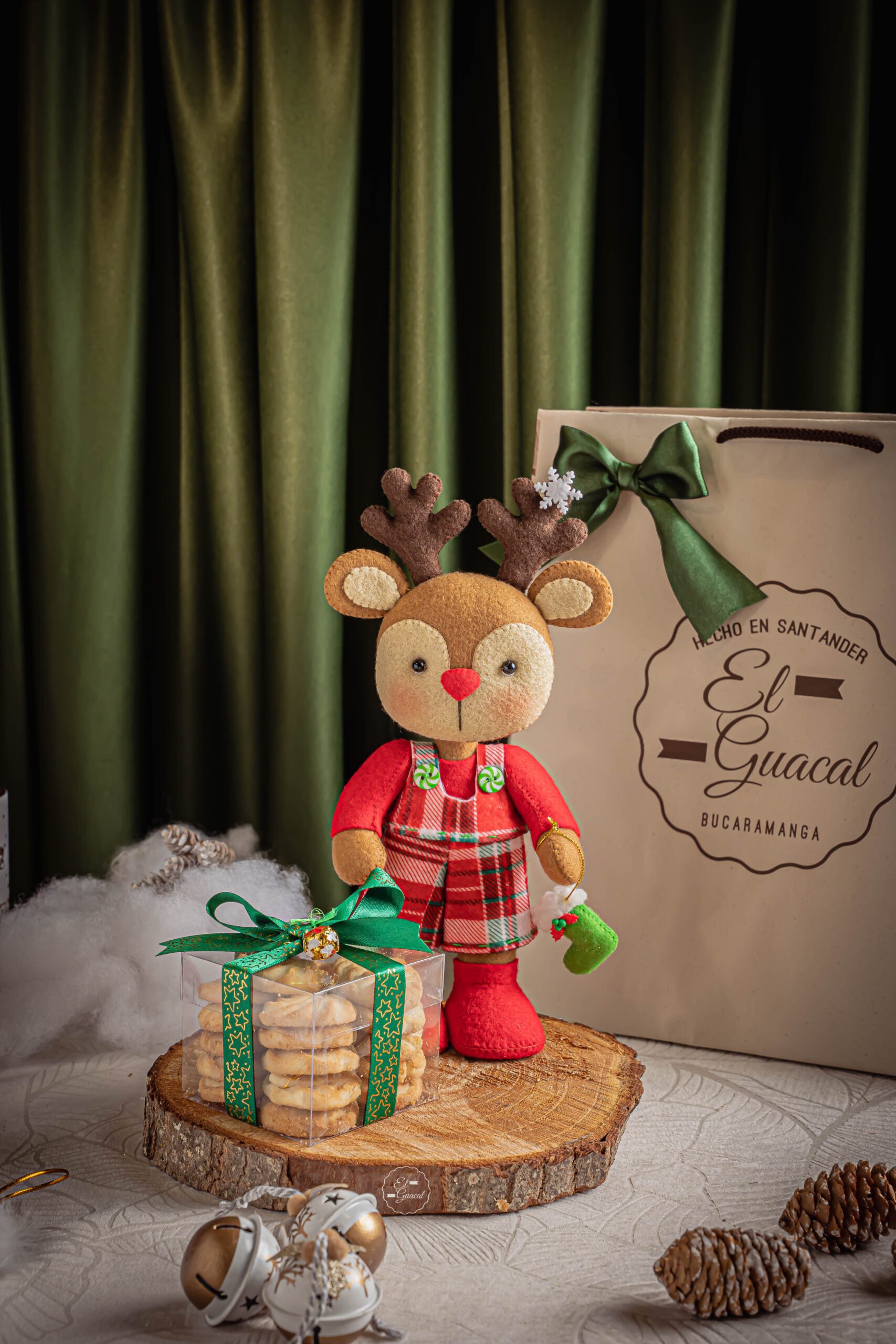 -Kit en bolsa de regalo con: -Reno hecho a mano -Galletas navideñas -Tarjeta con mensaje y de/para